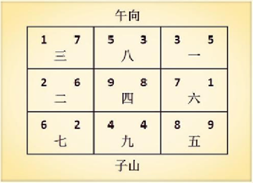子向屬天元龍,子向的城門在乾與艮。一運午山子向,挨星二到乾、四到艮。二之後天八卦原宮的天元龍為陽,故二逢陽順飛,旺星不能到乾。四之後天八卦原宮的天元龍為陽,故四逢陽順飛,旺星也不能到艮。所以,一運午山子向的向方兩旁,都沒有城門旺星可取。