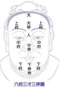 二.发际之下为天中。其次为南岳。又名火星。又其次为天庭。又其次为司空。又其次为中正。中正一名华盖。而气色部位。则以华盖包括司空中正两部。两眉之中。方为印堂。印堂者。君位也。此为全面部之主。由天中至印堂。共六个部位。勿论高低。匀分六部可也。
