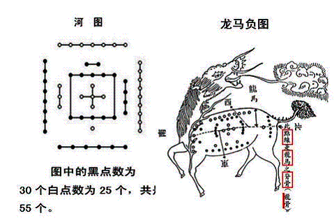 相传,上古伏羲氏时,洛阳东北孟津县境内的黄河中浮出龙马,背负“河图”,献给伏羲。伏羲依此而演成八卦,后为《周易》来源。又相传,大禹时,洛阳境内洛河中浮出神龟,背驮“洛书”,献给大禹。大禹依此治水成功,遂划天下为九州。又依此定九章大法,治理社会,流传下来收入《尚书》中,名《洪范》。《易•系辞上》说:“河出图,洛出书,圣人则之”,就是指这两件事。