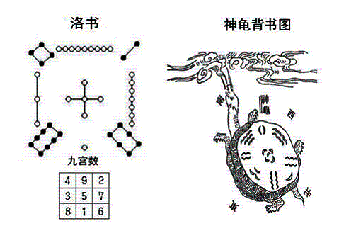 洛书本为彩图,但古时印刷困难所以仍用黑白点作图。将河图四方的八个数旋转而排成八方而显八卦,每方一个数纳地支十二气象,就是洛书之图了。只不过将火的2、7数与金的4、9数交换了位置,同时土五为中显用而寄八方,故为九星,土十则不显而藏于用。这样成:戴9履1,左3右7,4、2为肩,8、6为足,5居中央,九个数纵横交叉皆为十五数,尽显五行之妙,将先天之体化为后天之用了。其图如下: