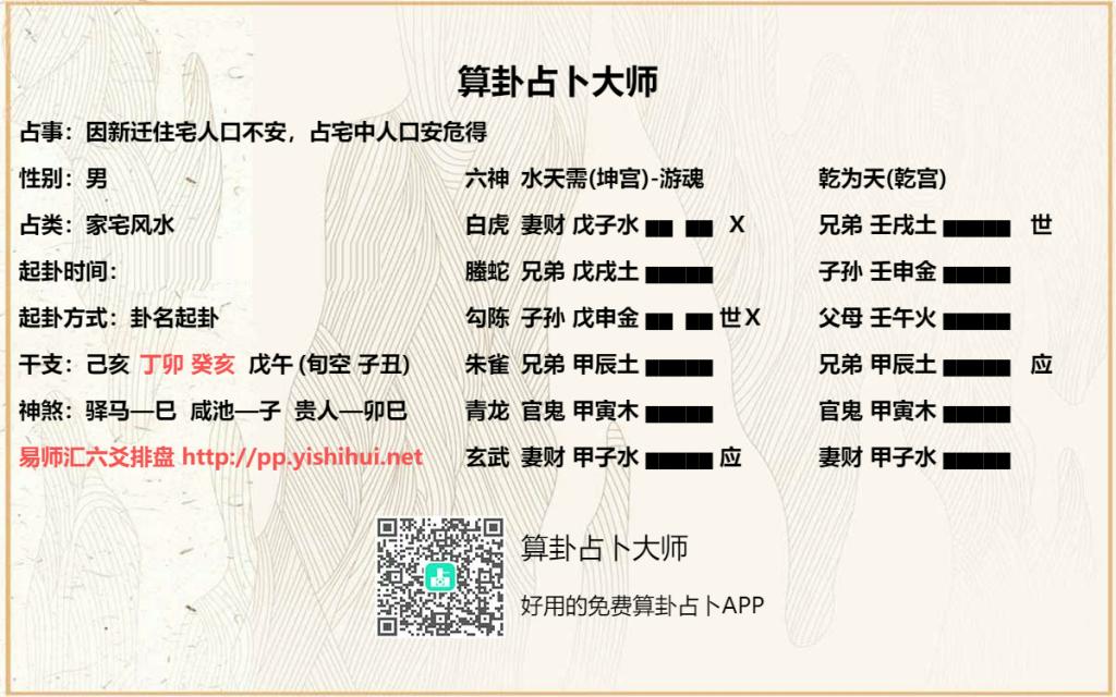 例1:卯月癸亥日,因新迁住宅人口不安,占宅中人口安危得“需之乾” (原增删卜易中 卦例42)