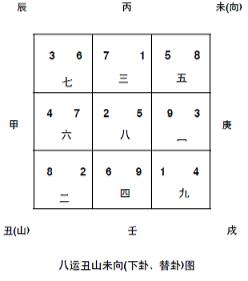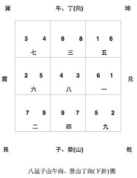 此局八運八白土星入中,中宮右上角“3”為向星,中隔九運、一運、二運,每運二十年,總共六十年地運。