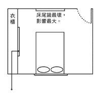 鏡 不 宜 放 於 床 頭 或 床 尾 對 著 床 的 方 向 。 鏡 在 床 頭 上 易 發 惡 夢 , 對 床 尾 則 易 感 反 胃 頭 暈 , 精 神 不 佳 , 易 受 驚 。 反 而 , 鏡 若 攔 腰 對 床 則 無 影 響 。