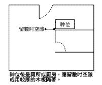 神 位 等 放 於 穩 陣 位 後 , 仍 要 注 意 背 後 是 否 廁 所 或 廚 房 , 若 是 , 則 神 位 背 後 要 留 數 吋 空 隙 。