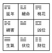 我 們 從 右 的 八 宅 圖 得 出 , 此 局 之 底 部 中 央 為 三 爻 不 變 ( 伏 位 ) , 從 左 至 右 與 中 央 兌 卦 相 比 , 得 出 乾 卦 為 生 氣 , 坎 卦 為 禍 害 , 艮 卦 為 延 年 , 震 為 絕 命 , 巽 卦 為 桃 花 , 離 卦 為 凶 位 , 坤 卦 為 財 位 , 中 央 為 控 制 室 。