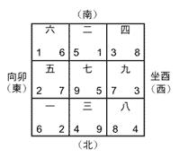 此 局 打 海 位 置 為 正 西 , 整 個 布 局 四 面 為 四 正 位 , ( 即 正 東 、 正 南 、 正 西 及 正 北 ) 。 於 是 我 定 了 一 個 七 運 是 最 旺 的 方 位 坐 酉 向 卯 ( 即 坐 西 向 東 ) , 因 坐 酉 向 卯 在 七 運 飛 星 計 算 是 旺 丁 旺 財 之 局 , 然 後 再 用 八 宅 法 分 定 吉 凶 位 置 。 首 先 我 把 飛 星 及 八 宅 之 吉 凶 位 置 例 圖 如 左 :
