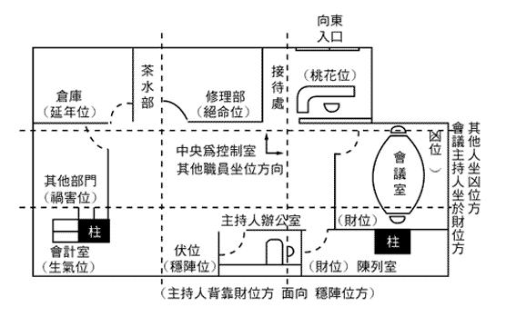 此 局 經 布 置 後 格 局 如 下 : 右 中 央 吉 位 為 負 亡 人 辦 公 室 。 財 位 為 管 理 財 務 之 辦 公 位 , 桃 花 位 則 為 外 勤 人 員 之 坐 位 , 凶 位 作 廁 所 之 用 。