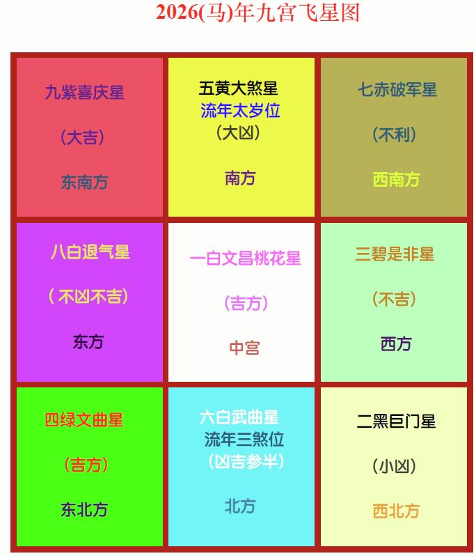 2026年,流年丙午,生肖屬馬,是下元九運的第三年。本年九紫右弼當運財星入主東南方巽宮,此為大吉之方;一白貪狼近旺生氣吉星飛臨中宮,此為吉方;四綠文曲星入主東北方艮宮,此為吉方;八白左輔退氣之星入主正東方震宮,此為無吉無兇平常之方;六白武曲吉星飛入正北方坎宮,但流年三煞又同時到方,此為吉兇參半之方。