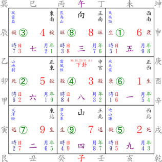 紫白飛星雙星交集會合之後,便會產生種種不同的變化與現象,無論那種組合都代表不同的預兆和吉凶。在九星飛伏中,共有九九八十一個飛星的組合。