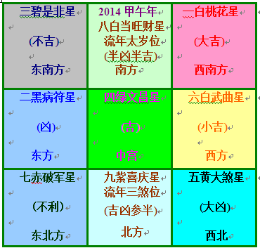 2014年,流年甲午,生肖屬馬,是下元八運的第十一年。本年一白貪狼進氣吉星飛臨西南方,此為大吉之方;四綠文昌星飛臨中宮,此為吉方;六白武曲權貴吉星飛臨西方,此為小吉之方;本年八白當運旺財之吉星入主南方,但流年太歲又位臨此方,此為凶吉參半之方;九紫生氣喜慶之吉星加臨北方,但流年三煞又同時到方,此也為凶吉參半之方。