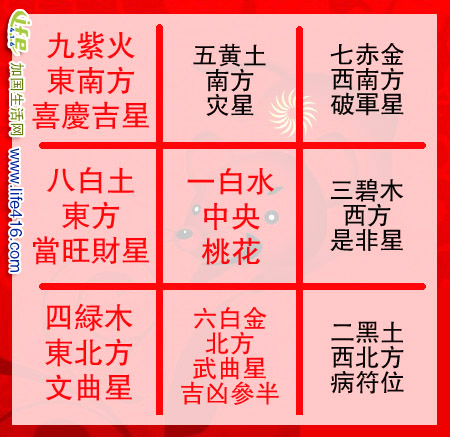 九紫是下元八运的生气星,主情缘及喜庆之事。如大门、窗口、睡床在此方,又与家人宅命相配,则有利于嫁娶、添丁、升职、置业等吉庆喜事。