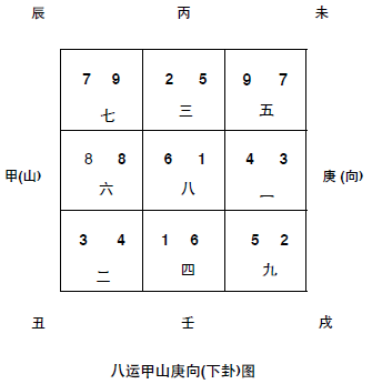 此局八白当旺丁星和财星同时飞临坐山甲方震宫(东方),三八合生成数,主贵 。此方如有来龙、高山、高楼、高阜,主旺丁;若又见湖泊、池塘等圆润之水,又主旺财。如坐山方有秀水在前,水后有高度适当的秀山,主丁财两旺,富贵悠久。此方最宜开门,大门、房门、灶门开在此方者,丁财骏发。此方也宜用作主人房、客厅成厨房。