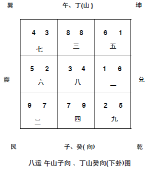 坐山方离宫(南方),双8丁、财两旺星同时飞临,为财星上山,如坐后只有高俊的秀山,而不见水,则旺丁不旺财。 唯有坐后有园润秀美的小水(低田、溪水或池湖),水外又有高俊的秀山(或高楼),才主丁财两旺。坐后不宜见大水,否则主损丁。坐方运星三碧木生地盘九紫火为木火通明之象,主生聪明贵子。此方宜开门、窗纳气,宜作主人房、书房、旺丁房或厨房之用。