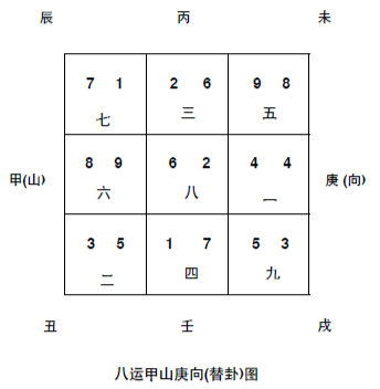 八运甲山庚向兼向替卦比双星会坐的八运甲山庚向正向下卦稍胜一筹。此局当旺八白丁旺星到坐,主旺丁,虽衰星到向不旺财,但正城门未方八白当旺财星飞临,若开大门纳气,则可挽回败局,形气配合得宜,仍可使宅局丁财两旺。