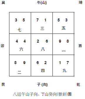 衰⼭衰向的八运 午山子向 、丁山癸向替卦星盘完全相同。此局与比双星会向的八运子山午 、癸山丁向下卦大为逊色。此局坐向均是衰星,是损丁伤财之衰局。