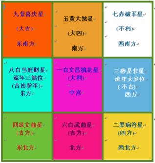 本年五黃大煞星飛臨南方離宮,此為大凶之方;二黑病符星飛入西北方幹宮,此為凶方;三碧祿存是非星加臨西方兌宮,流年太歲又位臨此方,此為不吉之方;七赤退氣破軍星飛臨西南方坤宮,此為不利之方。