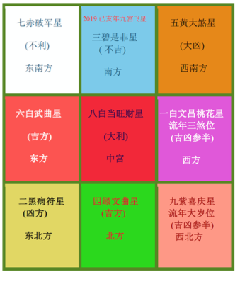 2019年,流年己亥,生肖屬豬,是下元八運的第十六年。本年八白當運旺財之吉星入主中宮,此乃大吉大利之方;四綠文曲星飛臨北方坎宮,此為吉方;六白武曲權貴星飛臨東方震宮,此同為吉方;九紫生氣喜慶吉星飛臨西北方乾宮,但流年太歲又位臨此方,此為凶吉參半之方;一白貪狼進氣吉星飛臨西方兌宮,但流年三煞又同時到方,此也為凶吉參半之方。