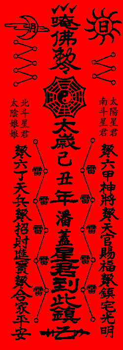 (2)祭品:清茶、水果、花生、糖果也可用鸡、烧肉、酒、太岁符太岁衣及各类金银寿金,必须在太岁符和 摄太岁的帖文上写上个人的姓名和出生年、月、日、时。