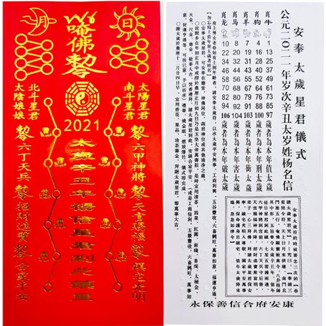 1、填寫太歲符。太歲符是專用於化解衝犯值年太歲的一種符籙,可解除衝犯太歲而帶來的煞氣,也是祈請太歲護佑的最佳方式,效力遠強於任何一種開運吉祥飾品。太歲符有固定的格式,多為印刷成紅底金字或黑字的紙符,上有“奉請辛丑年楊信太歲星君到此鎮宅”和“天官賜福,鎮宅光明;招財進寶,合家平安”等字樣,及八卦、令符等。安奉者須在太歲符的反面右下角填寫自己的名字。值年太歲每年不同,太歲符不可跨年使用,今年必須使用牛(辛丑)年的太歲符化解犯太歲。