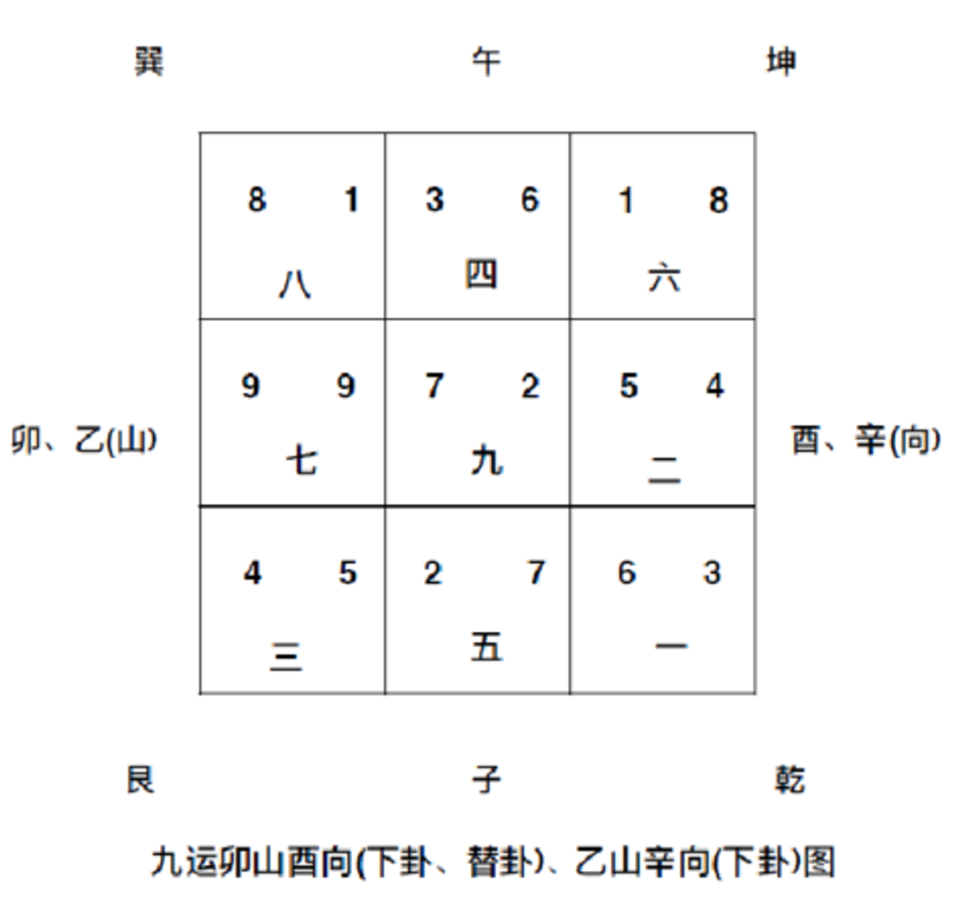 九運卯⼭酉向(下卦、替卦),乙山辛向(下卦)星盤完全相同。