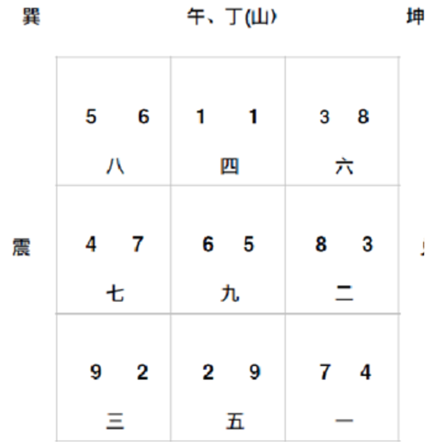 坐山午(丁)方離宮(南方),飛星組114。一白近旺生氣丁、財雙星到坐,坐後若有園潤秀美的小水(低田、溪水或池湖),水外又有秀麗的案山、朝山,(或高度適中的樓房),主丁財兩旺。坐後不宜見大水,否則主損丁。此方宜開門或開窗口納氣,宜用作臥室、客廳或廚房。一白文昌丁星與四綠文曲運星組合, 又為文昌位,宜設文昌房(書房、學生睡房),利讀書、考試和功名。