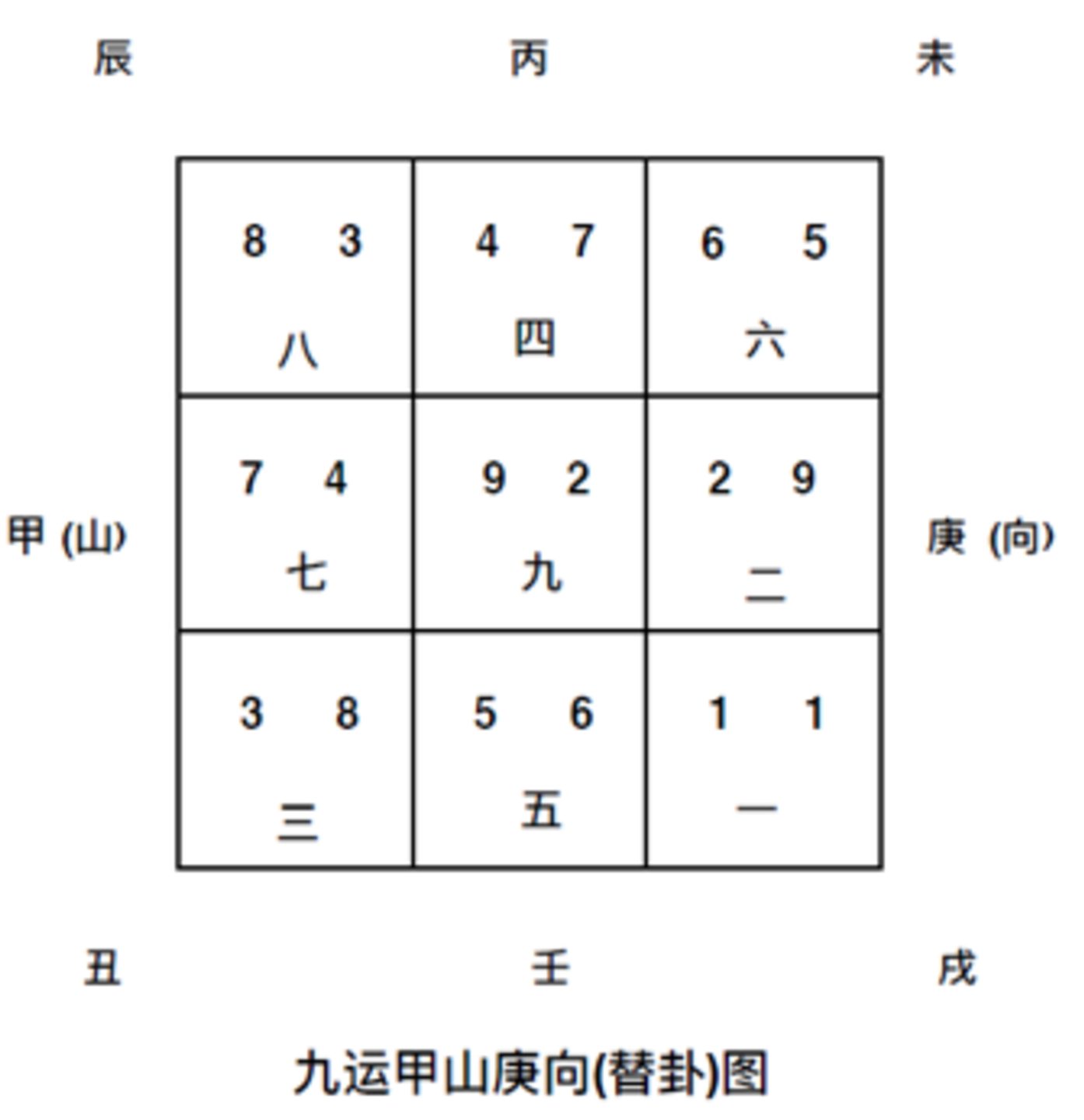 坐山甲方震宮(東方),飛星組合747,丁、財、運三星均為煞氣、死氣之星,此方宜平靜空曠,若山水逼壓,則主損財傷丁。且全為陰卦,“陰神滿地成群,紅粉場中空快樂”,主婦人當家,男女貪婬,當有桃花之劫。此方不吉,只宜用作衛生間或雜物房 。