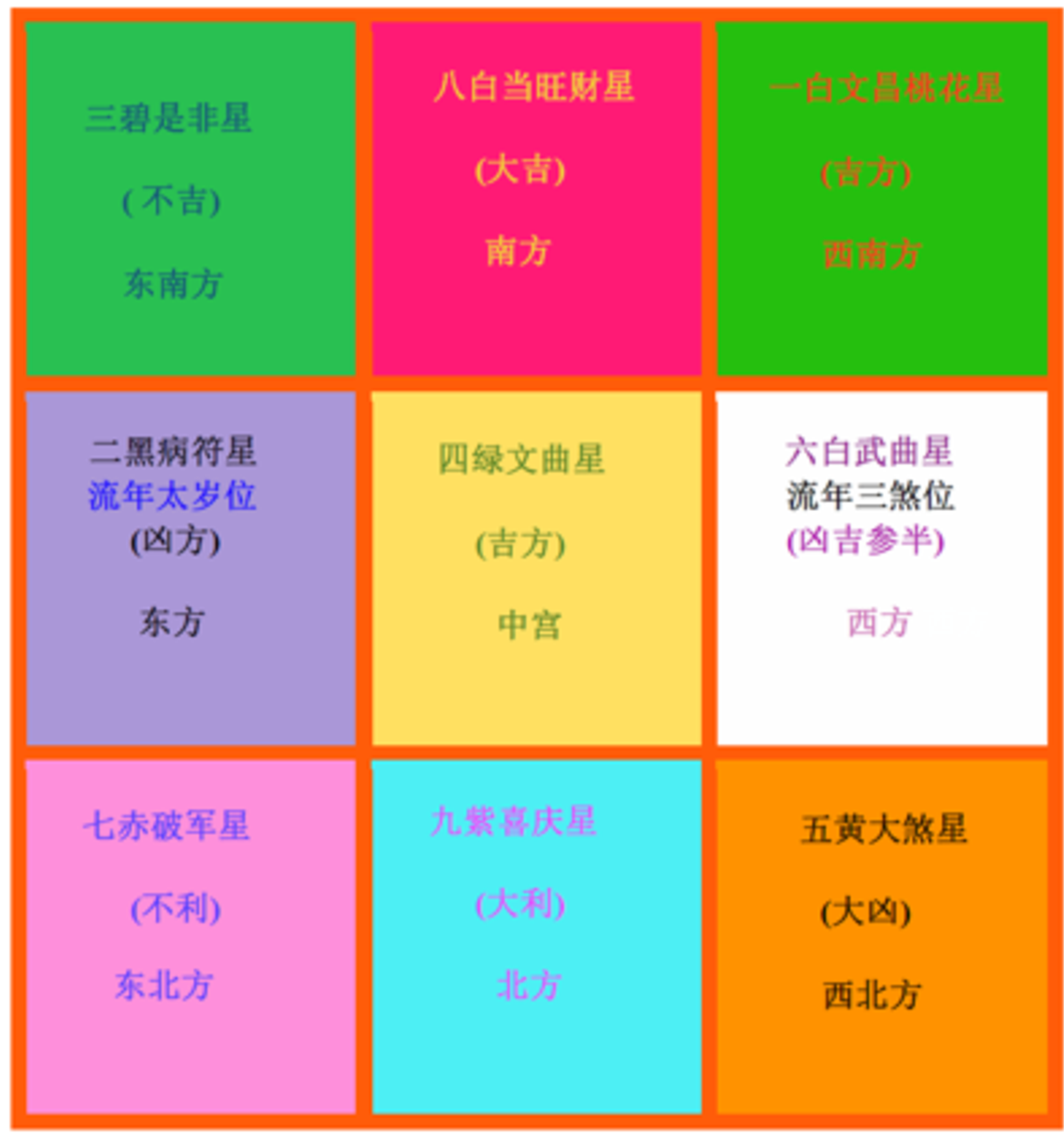 2、 正東方:今年二黑病符凶星飛入正東方震宮,流年太歲又位臨此方。