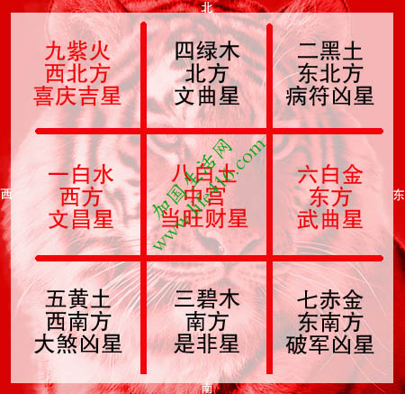 2010庚寅流年,生肖属虎,是下元八运的第七年。本年八白当运旺财之吉星入主中宫,此乃大吉大利之方;流年大利西方,一白贪狠进气吉星飞临;六白武曲权贵吉星飞临东方,此乃当旺吉方;西北方有九紫生气吉庆之星飞临,也为吉利之方。