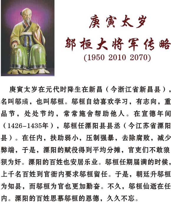 “太歲神”,是中國道教對天上分管人間禍福之神的尊稱,簡稱“太歲”、或稱為“歲神”、“歲君”、“大將軍”等,是諸神之中最有權力的年神。古書《協紀辨方》雲:〝太歲為百神之統,俗謂年中天子〞。太歲神一共有六十位,依六十甲子輪流當值,周而復始迴圈不息,故稱“值年太歲”。2010年庚寅流年,當值太歲姓鄔名桓。