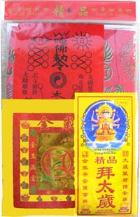 (2)祭品:清茶、水果、花生、糖果也可用雞、燒肉、酒、太歲符太歲衣及各類金銀壽金,必須在太歲符和 攝太歲的帖文上寫上個人的姓名和出生年、月、日、時。