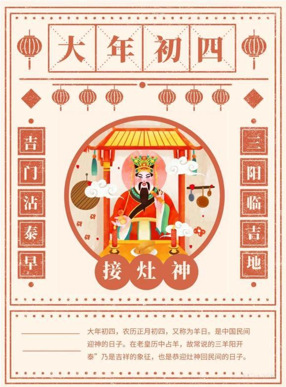 大年初四是恭迎灶神回民间的日子。灶王爷要点查户口,所以家家户户都要守在家里,准备丰富的果品,焚香点烛并施放鞭炮,以示恭敬。