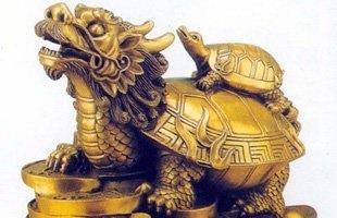 龜,自古便是健康、長命、穩健的圖騰。神話中龍生九子,龍龜是其中一子,其頭像龍身體卻像龜。龍頭可以納福招財,龍的龜殼和尾巴有化煞熱擋煞的功效。所以龍頭龜是家居風水當中最常用,也是最祥瑞的一個吉祥物。因為它不但能夠招財納福,又可鎮宅擋煞,因此是平安、成功、富貴、發達之象徵。在寫字臺上擺放一隻龍頭龜,則會在工作上得到貴人的扶持,得上司欣賞,工作會更加順利。龍龜更宜用作鎮宅興家之用。如用龍龜招財,將龍龜正對大門及窗戶可吸納財氣入宅,在宅中擺放龍龜有聚生氣之作用,可旺人丁。家中有官非、是非、犯小人、資不抵債,財運衰弱等問題,宜擺放龍龜在大廳中,化解兇氣。龜會吸收天地山川的靈氣,所以特別長壽,因此,在老人家的睡房裏擺放龜形的裝飾品來象徵健康長壽,甚為適宜。龍龜在化煞方面既有龍的威武剛強,亦有龜的忍辱負重陰柔,是化煞的最佳物品。假如你的宅門、視窗對面有尖角沖射,或者對面有人掛上八卦鏡、三叉之類實形物品,你可在門前、窗前懸掛龜殼或擺設龍龜或養一缸龜,只要龜頭對準沖射入來的尖角,便可收化解之效。