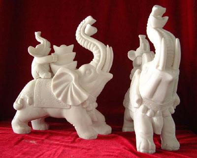 大象身軀龐大,性情卻溫和柔順,知恩必報,故被稱為獸中之德者,是平安,穩定,豐滿而富貴的象徵。大象五行屬金,以善吸水馳名。風水學以水為財,凡家居大門、視窗見江河湖海或水塘水池,均稱為“明堂聚水”,可在家中擺放象鼻向下的「吸水象」,面向水源的位置,象鼻向出,造就大象吸水為財之象,可令財源滾滾。在室內財位擺放大象,則可旺財。另外,大象體積墩厚,如山一般,當房屋前高後低或屋後無靠時,可在屋後靠近坐方,擺放玉石大象坐鎮,加強坐方的力量,可增加貴人運,助旺事業運。象鼻向上的稱為「噴水象」,象徵噴出歡樂喜悅,安放家中可令人心境開朗,笑臉常開。背頂大瓶子的象稱為「太平有象」,又叫「送寶象」,具如意吉祥、招財進寶之意。大象背一小男孩,稱為「送子象」,寓意送子送貴。大象中以白象最為罕見珍貴,因此用白玉所雕制而成的象具有催旺權貴的風水效力。象要以一雙一對來放,並分左右,兩條尾巴應呈「八」字形,便是正確的方法,象徵發財。