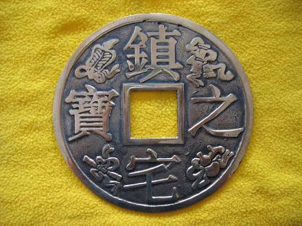 大銅錢外圓內方,外圓代表天,內方代表地,中間的黃帝號代表人,三才具備,力量很強。大銅錢的性質剛,五行屬金,銅質吸收氣場的力量比金銀都好,可泄去二黑及五黃之土氣。 正面有鎮宅之寶4個大字,背面為對應吉祥物圖案+“五福臨門”字樣的大銅錢具鎮宅化煞和招福納財之功效,此大銅錢可掛放在大門口,或大門口玄關處,面朝門口,就能起到極強的鎮宅和招福納財之效果。一般的大銅錢擺 放在住宅大門的門檻內,能化解大門與別家大門相對,或是大門外是電梯,上下樓梯等沖煞;放在大門右側,以黃線或黃線串上掛起,可防家中女性口舌過重;將兩個大銅錢放在枕頭底下,可保夫妻關係良好。