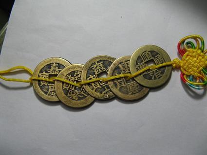 五帝錢是指清朝順治、康熙、雍正、乾隆、嘉慶五個皇帝時期鑄造的銅錢。這五個皇帝所統治時期是清朝最興旺之時,皇氣旺朝代氣數旺,所鑄造的銅錢也旺。五帝古錢經歷了數百年歷史,經萬千大眾使用流通,旺錢又沾上了無數人的磁場能量,從而旺上加旺。五帝錢既有盛世的“皇氣”,又有日子攸久的“天氣”和眾人使用過的“人氣”及其出土的“地氣”,因此能量超群,有旺宅運,擋煞氣,增強人的運氣的多重作用。把五帝錢放在住宅大門的門檻內,可擋尖角沖射、飛刃煞、槍煞、反弓煞、開口煞;放在身上可以避邪,不被邪靈騷擾;或用利是封包裝著,放入銀包或手袋,可增強自己的財運;在神抬、宅內財位擺放五帝錢可旺財。或用紅繩穿著掛在脖子上或縣掛在大門口,可以辟邪,以免被邪靈騷擾。