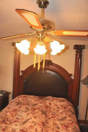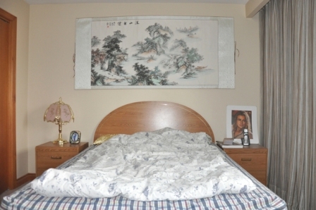 在二楼卧房,刘燮钧发现Marry两个儿子的床头都挂上了巨幅山水画(图5)。他说:“名山大川压在你儿子的头上,肯定会让他们感到生活疲惫,而且压力很大。建议你把这些山水画挂在其它地方。”同样问题还出现在Marry的主人房里。Marry把床摆放在正对风扇的下面(图6)。另外,一扇明亮的试衣镜也正对卧床。刘燮钧介绍说:“床头的方向和位置非常重要。你的卧房存在两种忌讳。首先,风水学忌讳"横梁压顶"。虽然卧房上没有横梁,但这个风扇也会对你产生不利。第二,床头不宜正面对镜子。镜子是用来阻挡煞气的,目的是把直冲来的煞气反射回去,所以不宜正对着床”。