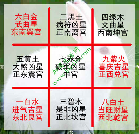 2011辛卯流年,生肖属兔,是下元八运的第八年。本年八白当运旺财之吉星入主西北方,此乃大吉大利之方;一白贪狠进气吉星飞临东北方,此为大利之方;六白武曲权贵吉星飞临东南方,此为吉方;四绿文昌星飞临西南方,此为小吉之方;西方有九紫生气吉庆之星飞临,但又为流年三煞位,故为凶吉参半之方。