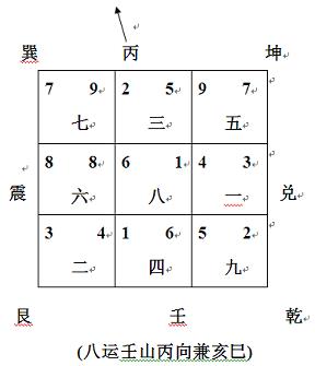 B、排山盤:根據〝出卦不論是否陰陽相同必用替〞的法則,壬山丙向兼亥巳,壬屬坎宮(坎卦)與屬乾宮(乾卦)相兼是為出卦相兼則用替星。四到坐,四之地元龍為辰,根據中州派所傳替卦口訣:〝巽卦三山皆武曲〞(巽、巳、辰三山用武曲替,武曲即六白星),故不用4而用6入中,寫在中宮左上角,辰山屬陰,飛星逆行。